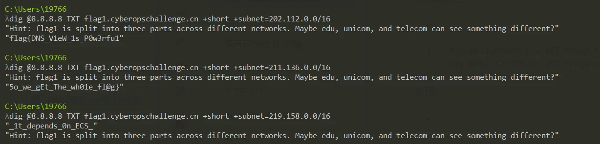8dig @8.8.8.8 TXT flag1.cyberopschallenge.cn +short +subnet=202.112.0.0/16